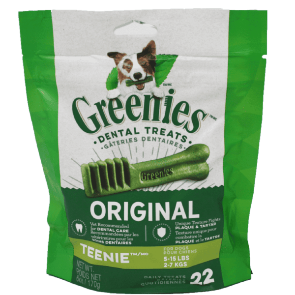 Greenies Original Teenie Dog Dental Treats is all it takes for clean teeth, fresh breath and a happy dog. These original-flavor dental dog chews are delicious and also feature a chewy texture that fights plaque and tartar. Veterinarians also recommend these tasty dental treats for at-home oral care. Greenies Original Teenie are also made with highly soluble ingredients for easy digestion.
