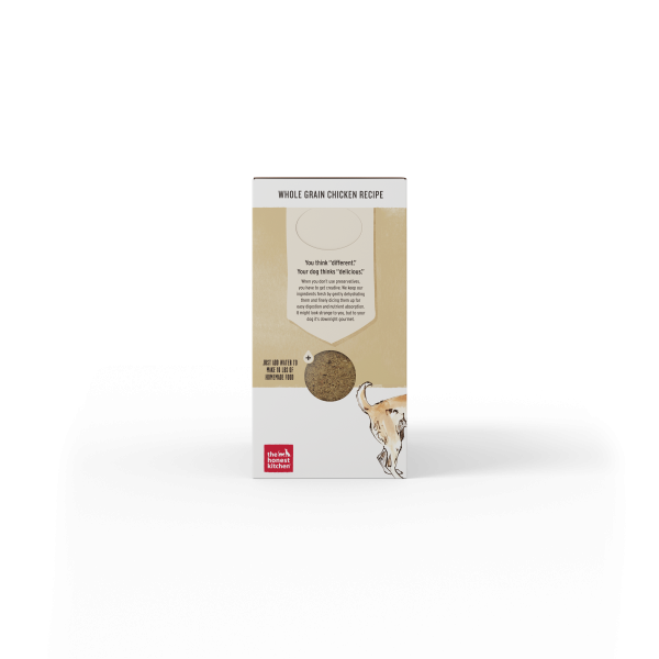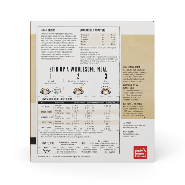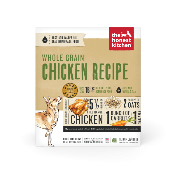 Honest Kitchen Dehydrated Chicken Recipe is a great meal for your pup. In addition this whole grain recipe is made with real ingredients, like free range chicken, that is gently dehydrated to maintain nutrients & taste. Additionally this recipe can be a full meal or just a topper. Just add warm water and wait three minutes for a tasty, homemade meal that your pets will love!