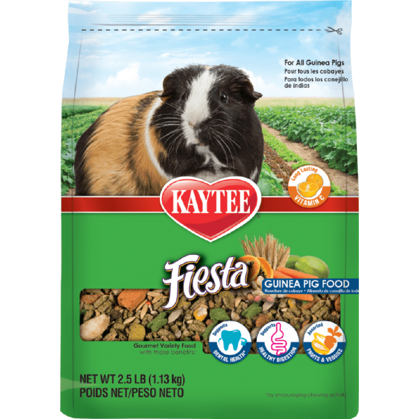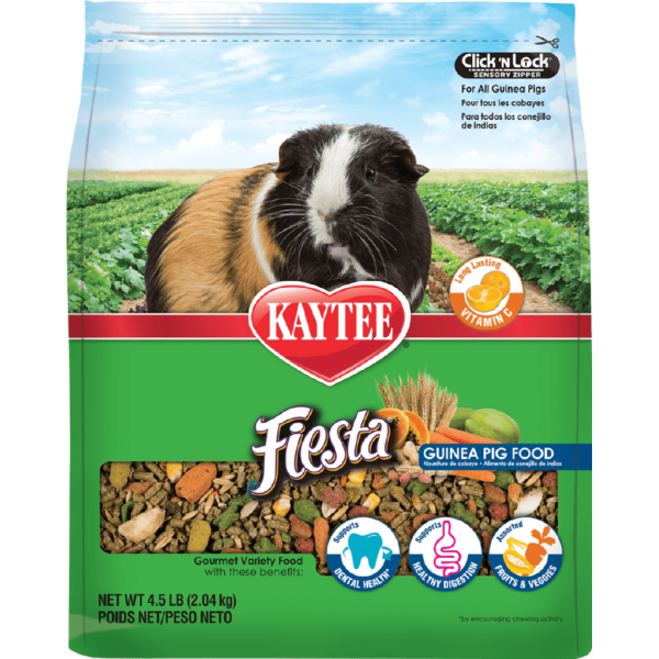 Kaytee Fiesta Guinea Pig Food is a nutritionally fortified gourmet diet made of a premium blend of fruits, vegetables, seeds and grains. It offers maximum variety, fun and nutrition for small animals. Fiesta also contains prebiotics and probiotics to support digestive health, formulated with your small animal species in mind.